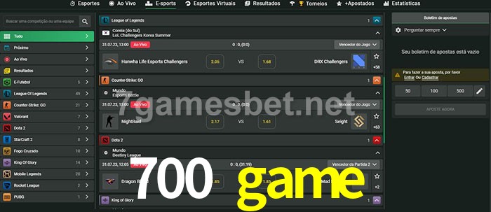 O 700 game oferece uma grande seleção de opções de apostas em e-sports com probabilidades competitivas